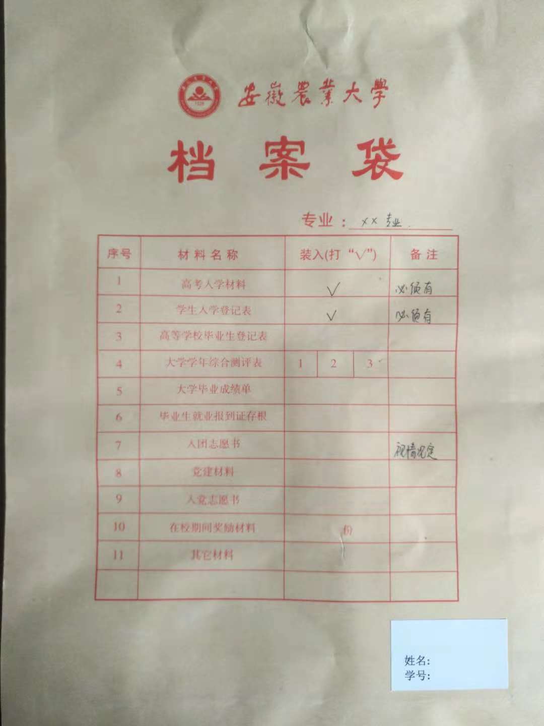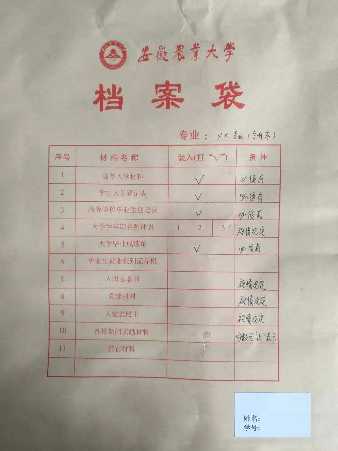 所有档案材料装入新档案袋中,并在档案袋目录对应位置勾选,格式参照附1、附件2。所有由高中传递来的材料,如高中学籍表、高考报名登记表、高考体检表等归入高考入学材料类;入党申请书、入党积极分子考察表等归入党建材料类;学年综合测评表(或学年小结)等,以学年为单位勾选;档案袋内无对应材料的不得勾选。档案袋上还应标明专业,以转专业后的专业为准。