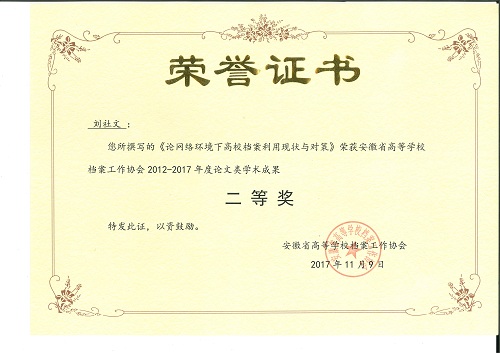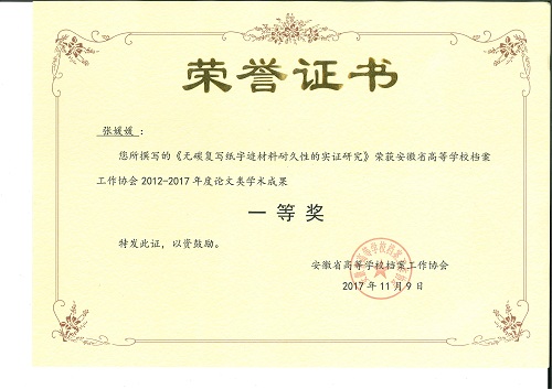 从11月8日至12日召开的安徽省高校档案工作协会2017年学术年会暨高校档案业务培训工作会议上获悉,在协会学术成果(2012年—2017年)评比中,我校张媛媛馆员发表的《无碳复写纸字迹材料耐久性的实证研究》获论文类一等奖;刘社文副研究馆员发表的《论网络环境下高校档案利用现状与对策》获论文类二等奖;管志权馆长等编纂的《回家(1987年—2017年)》纪念画册获档案编研类二等奖。本次安徽省档案工作协会申报学术成果共计55项,获奖25项。其中,论文类一等奖2项、二等奖5项、三等奖9项,档案编研类一等奖2项、二等奖3项、三等奖4项。