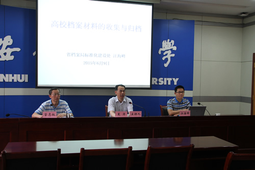 6月9日是国际档案日。该日上午,我校邀请安徽省档案局标准化建设处汪海峰副处长为全校专兼职档案员作了一场高校档案工作专题讲座。夏涛副校长到场指导,档案馆馆长管志权主持讲座。