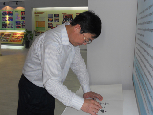 5月19日上午,陕西省供销合作总社党组书记、理事会主任李三原一行在茶与食品科技学院副院长张正竹教授、校办有关人员的陪同下参观校展览馆。档案馆蒋传和馆长向来宾介绍了我校83年来的发展历程。参观结束后,李三原主任欣然签名留念。