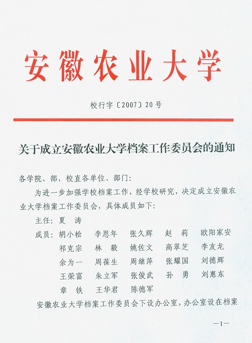 关于成立安徽农业大学档案工作委员会的通知