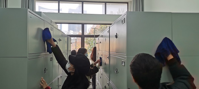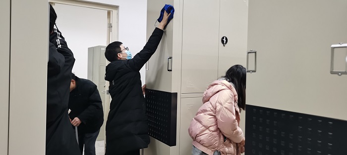 此次活动共有98名志愿者参加。在档案馆老师的带领下,大家分工明确,对档案库房进行打扫清理,对档案柜、密集架内外进行除尘去灰。与此同时,志愿者们还更换了档案柜中防霉杀虫药包,做好防霉工作。