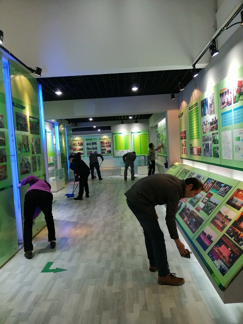 在参观结束后,全体党员甩开膀子、弯下身子,用自带的拖把、扫帚、抹布、水盆等工具,分组分工,开展了热火朝天的志愿清扫活动。经过一个多小时的“战斗”,把校史馆地面、展柜、展台、展板、装饰花、门外地面等清扫地一尘不染、窗明几净。通过此次活动,强化了劳动最美、劳动光荣的意识,增强了党员宗旨意识、责任意识、奉献意识,党支部的战斗堡垒作用和党员的先锋模范作用得到了进一步发挥。