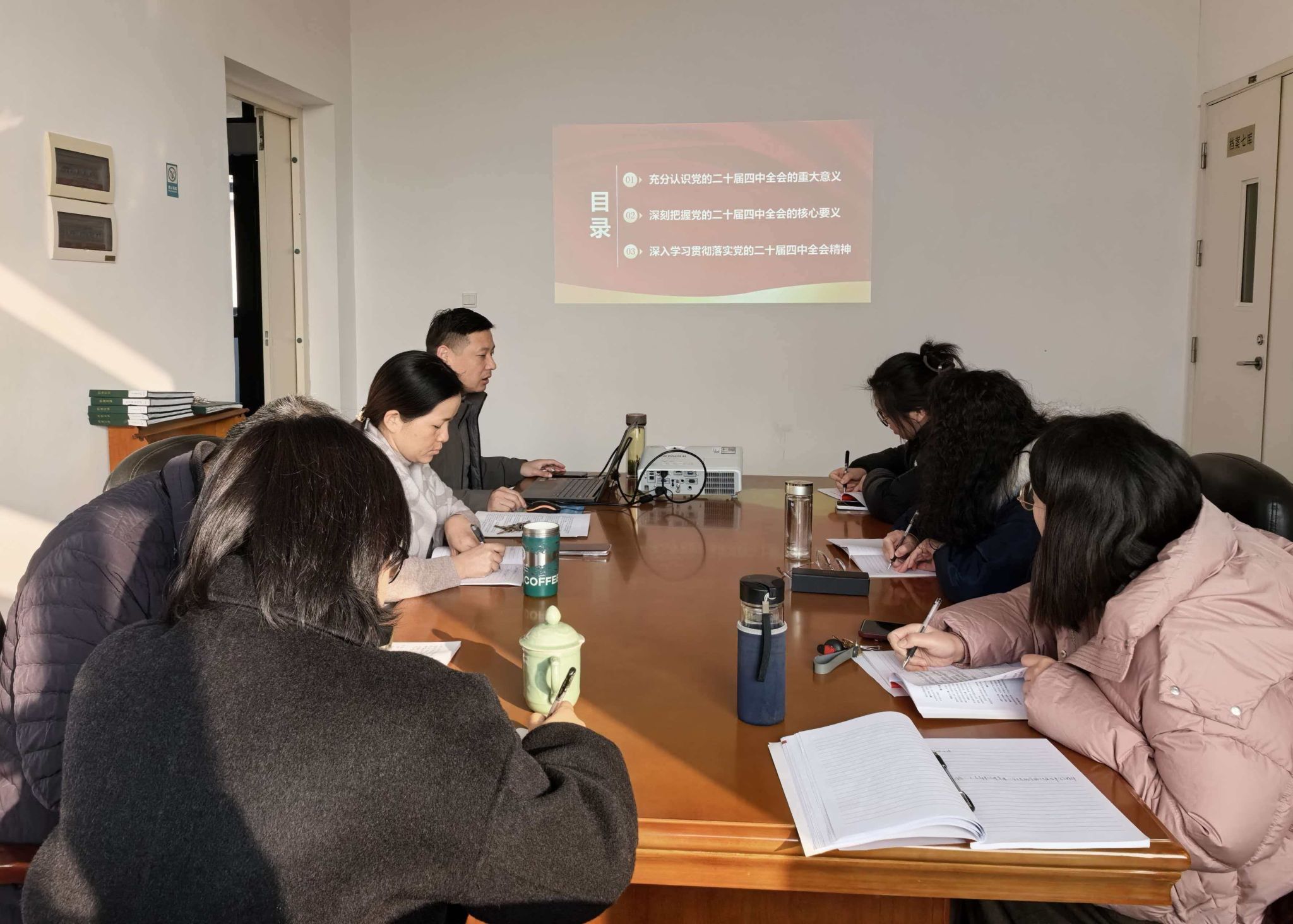 本网讯 12月18日上午,档案馆党支部开展支部书记讲党课暨第三次集中大课学习研讨会。党支部书记刘社文主持会议,并以《学习贯彻党的二十届四中全会精神》为题,为全体党员讲党课。