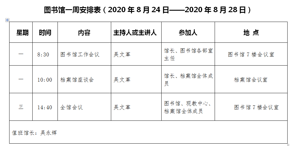 图书馆、档案馆一周安排表(2020年8月24日至8月28日)