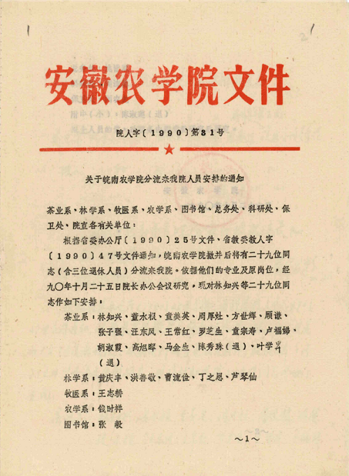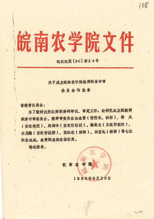 1982年9月,安徽省人民政府正式决定将安徽劳动大学改为皖南农学院,经过系科调整,主要保留了农学、茶叶等系科专业。随着皖南农学院的发展,院校之间交流也日益频繁。1986年,皖南农学院成立教师职务评审委员会(共7人),主要负责全院教师职务的评议和审定工作。在评审委员会人员组建上,皖南农学院来函商议,我校同意给予大力支持,并委派徐风教授、周海令副教授、杨其光副教授、余茂籍副教授担任该校教师职务评审委员会委员。这些委员为皖南农学院教师职务评审工作发挥了积极的作用。