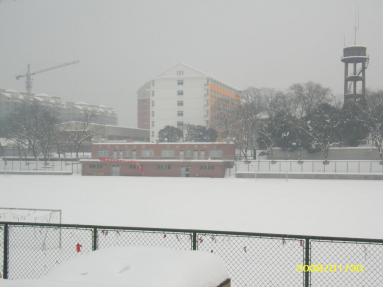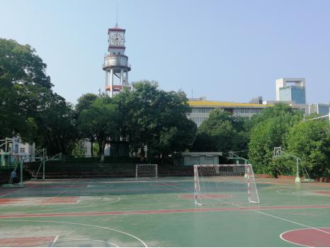 仰望自水塔改造而成的钟楼(图6),钟楼的底座是原来的水塔,水塔的顶部是大钟。水塔结构没有改变,只是对水塔钢构内外进行装饰,脚手架进行粉刷,水塔顶端圆柱形的蓄水池经过设计改造放置大钟。大钟为CJ-3900型号, 外观款式为四面,每面是正方形,钟面白色,边框均为红色。大钟上面还加盖了一个红色锥形的顶,顶上有避雷针直插云霄,非常有气势。大钟是现代智能的:微机控制,屏幕显示,三针运行,GPS卫星自动校时,走时与北京时间同步。大钟可选乐曲或钟声报时,兼有故障自诊断、子钟同步和夜间照明等功能。自此,水塔变钟楼,担负着为安农师生报时的重任。如今,十数年过去了,她风采依旧,朝朝暮暮,春夏秋冬,不辞辛劳为我们报告北京时间,同时一如往昔见证着安农师生运动场上挥洒汗水的身影和激情赛事,见证着安农校园的变迁和蓬勃发展,见证着悠悠岁月的人来人往。